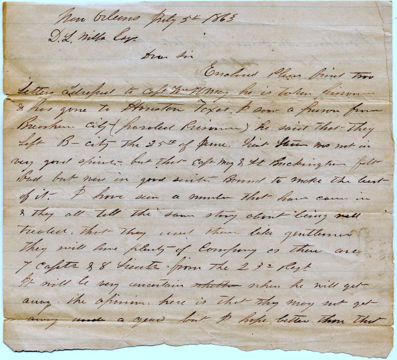 Letter re. Capt. Wm. May, July 5,1863, explaining he has been taken prisoner (p.1)