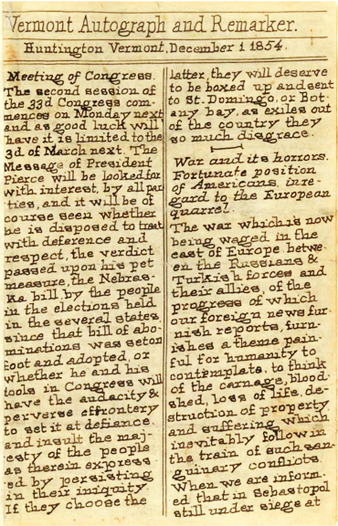 “As early as 1834, he pen-printed a newspaper, the Vermont Autograph and Remarker; each issue included five or six articles, totaling about fifteen hundred words–every letter printed by hand. He continued the Autograph until three months before his death [1867, age 76]. His pen-printed material consists of historical items, essays, fiction, poems, and political statistics.”