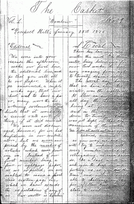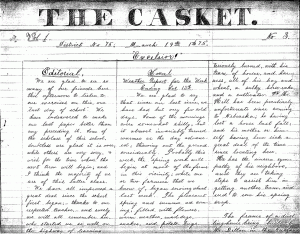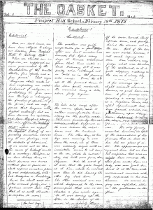 The Casket contains short news items, editorials anecdotes and student “compositions.” The weather apparently was of concern in all three extant numbers because of a bitter cold spell.